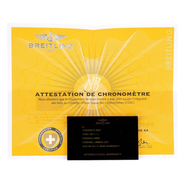 | Model Name: | Breitling Aeromarine Avenger II GMT Mother of Pearl Steel Watch A32390 Box Card |