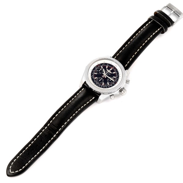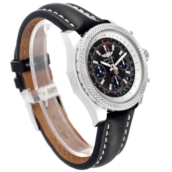 | Dial: | Black dial with luminous steel index hour markers. Luminescent stainless steel outlined hands.Globe design with longitude & latitude lines in the center of the dial. Large red-tipped central seconds counter hand with Britling logo contrweight. Date calendar window between 4 and 5. Three chronograph subdials - second, 30-minute and 12-hour. Dual rotating discs (city disc and 24 hour disc) for a quick readout of the different time-zones. |