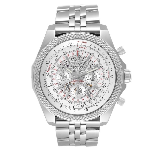 | Dial: | Silver dial. Luminescent stainless steel outlined hands. Large red-tipped central seconds counter hand with Breitling logo counterweight. Date calendar window between 4 and 5. Three chronograph subdials - 30-second, 15-minute and 6-hour. |