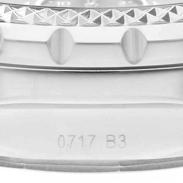 | Dial: | Black dial with luminous index hour markers. Luminescent stainless steel outlined hands. Day and Date calendar window at 3. Three grey chronograph subdials -- 60 seconds, 30 minutes and 12 hours. |