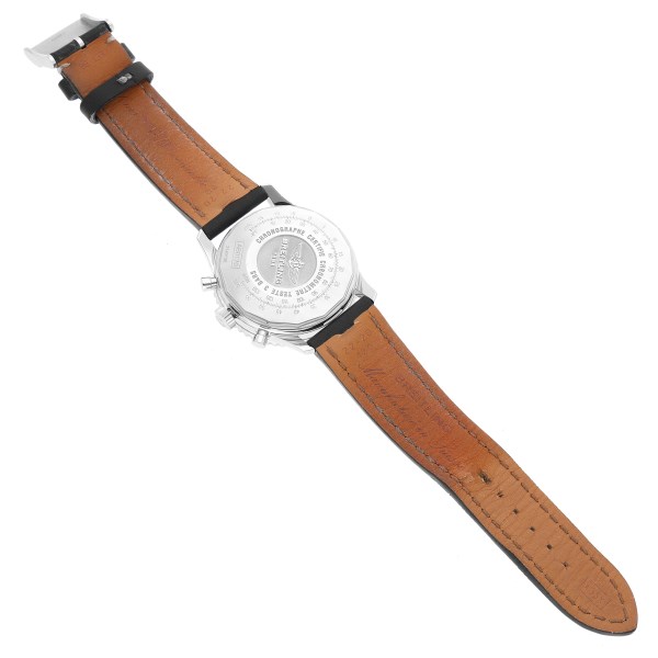 | Dial: | Black dial with steel index hour markers. Luminous hands. Three chronograph subdials to measure minutes, hours, and running seconds. Date window between 4 and 5 o'clock. Tachymeter scale around the outer minute track. |