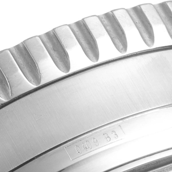 | Dial: | Black dial with applied steel baton indexes, subsidiary dials for the 12-hour register and seconds, outer graduations for the minutes and fifths of a second, the tachometer slide-rule on an inclined silvered reserve revolving with the bezel, aperture for the date. Steel feuille hands. |