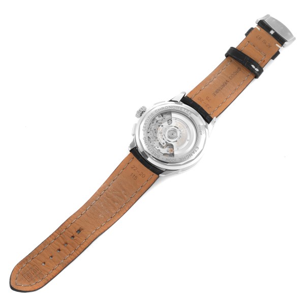 | Dial: | Silver dial with black subdials. Raised baton hour markers with luminous hands. Tachymeter around the outer rim. Calendar window at 6. Large central chronograph seconds hand. 30 minute counter sub-dial at 3 o'clock. Small seconds sub-dial at 9 o'clock. |