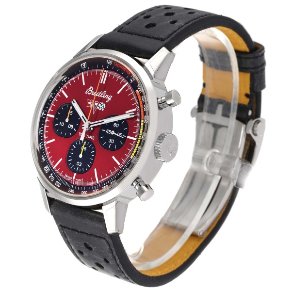 | Dial: | Red dial with black subdials. Luminous index hour markers. Stainless steel luminous baton minute and hour hands, orange and yellow chronograph hands. Black tachymeter around the outer rim. Small seconds sub-dial at 3 o'clock, 15-minute sub-dial at 9 o'clock, 6-hour sub-dial at 6 o'clock. |