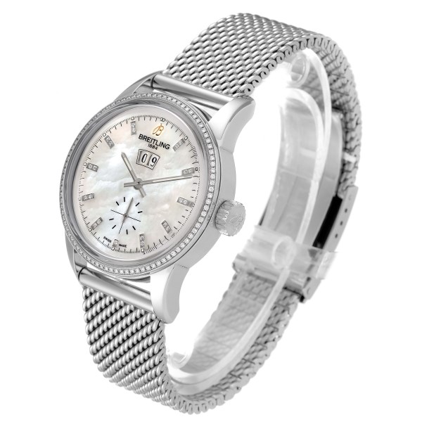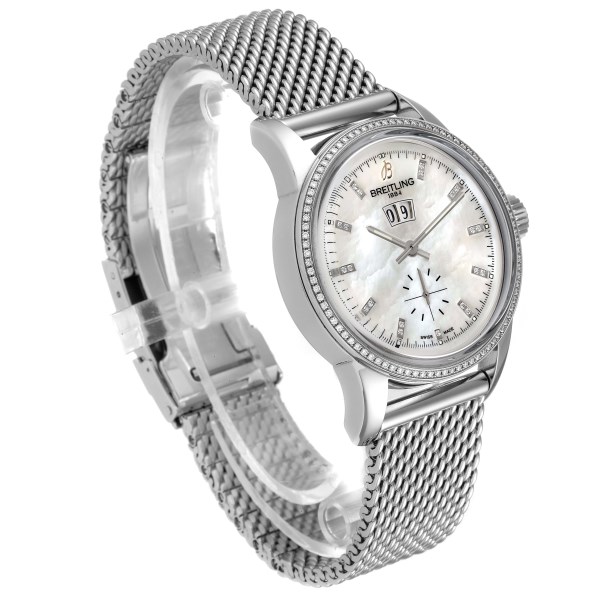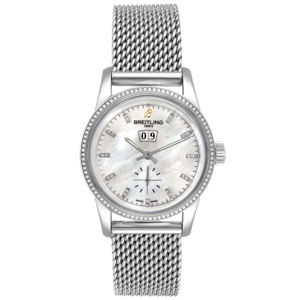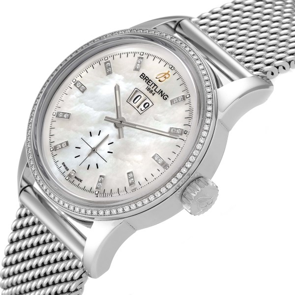 | Dial: | Mother of pearl dial. Index hour markers set with original Breitling factory diamonds. Big date calendar window at 12 o'clock. |