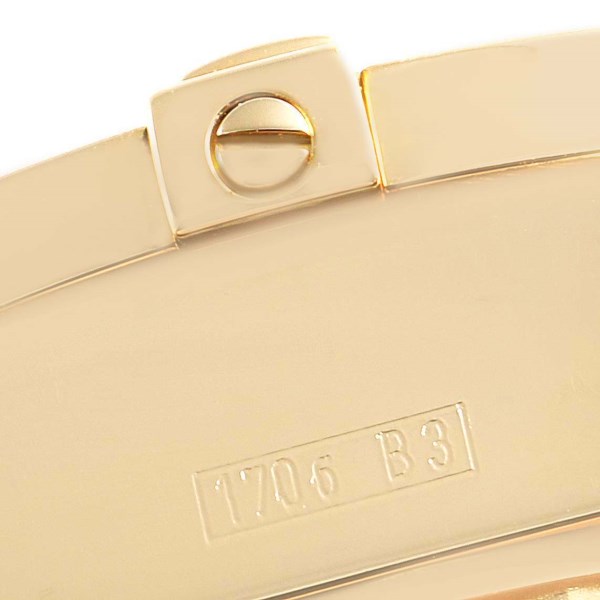 | Bezel: | 18K yellow gold unidirectional rotating bezel. Four 15 minute markers. |