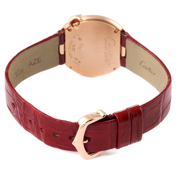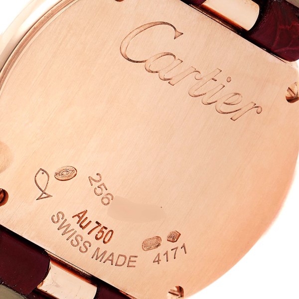 | Bezel: | 18K rose gold Cartier factory diamond bezel with larger solitaire diamond at the 4 o'clock position. |