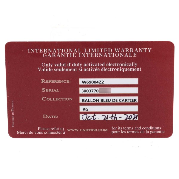 | Model Name: | Cartier Ballon Bleu 36mm Automatic Rose Gold Mens Watch W69004Z2 Box Card |