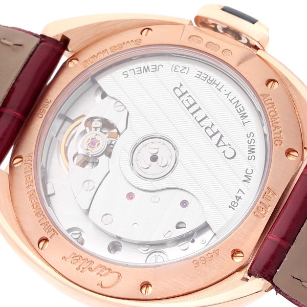 | Bracelet: | Burgundy Bordeaux leather strap with 18k rose gold deployant buckle. |