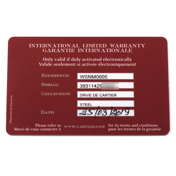 | Model Name: | Cartier Drive Retrograde Large Day Night Indicator Steel Mens Watch WSNM0005 Box Card |