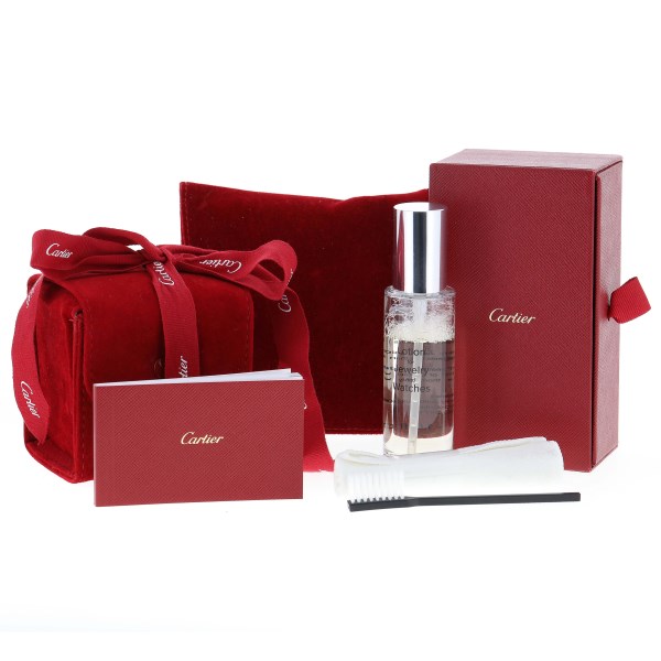 | Dial: | Silvered grained dial with black roman numerals. Sword shaped blue hands. Secret Cartier signature at VII. |