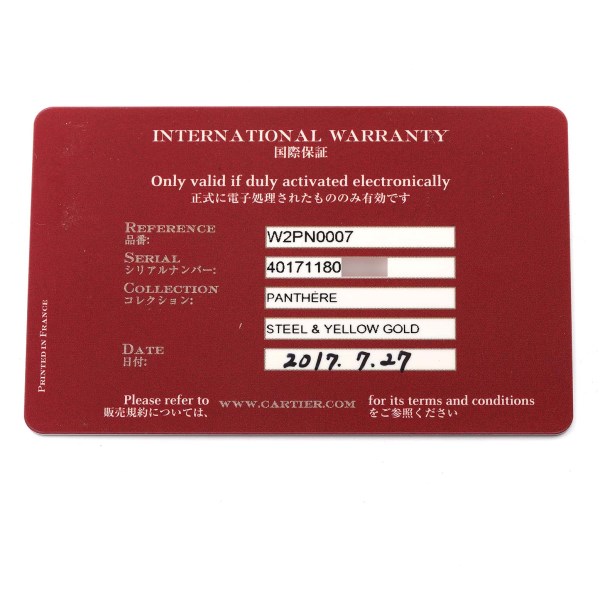 | Model Name: | Cartier Panthere Ladies Steel Yellow Gold 2 Row Watch W2PN0007 Box Card |