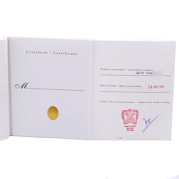 | Bezel: | 18k rose gold polished bezel with original Cartier factory diamonds, secured with 8 pins. |