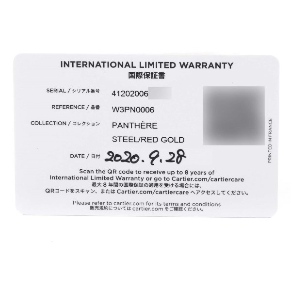 | Model Name: | Cartier Panthere Small Steel Rose Gold Diamond Ladies Watch W3PN0006 Card |