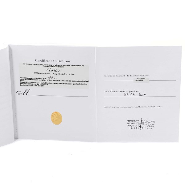 | Dial: | Silvered opaline dial with black roman numerals. Blue sword shape hands. Secret Cartier signature at VII. |