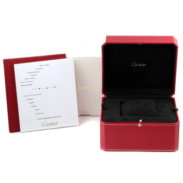 | Dial: | Silvered opaline dial with black roman numerals. Blue sword shape hands. Secret Cartier signature at VII. |