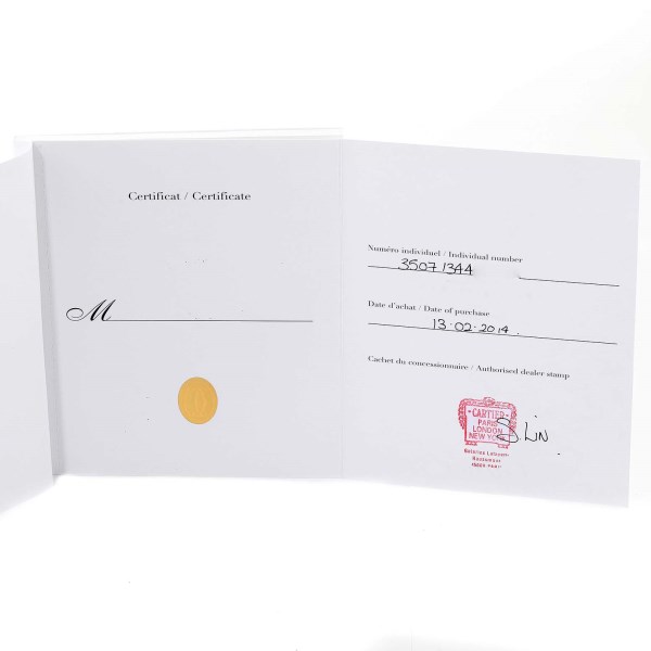 | Dial: | Silver guilloche dial. Painted black Roman numerals. Sword shaped blued steel hands. Secret Cartier signature at X. Date calendar window at 3 o'clock aperture. Secret Cartier signature at VII. |
