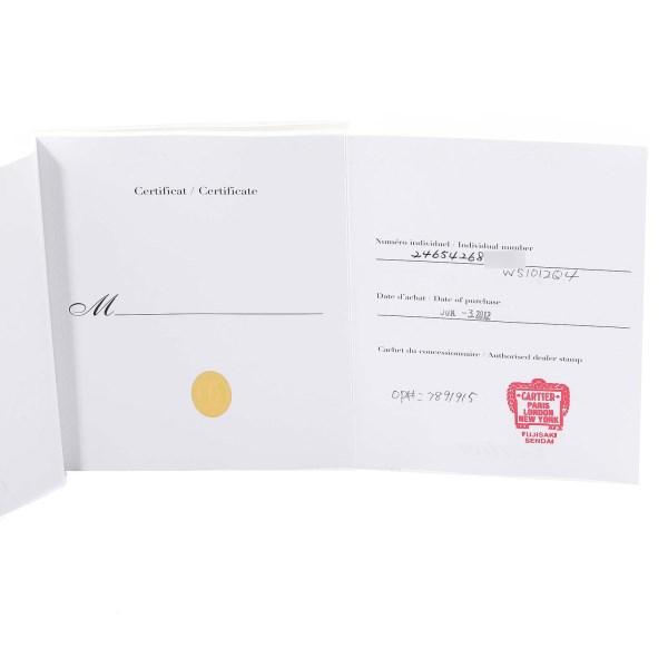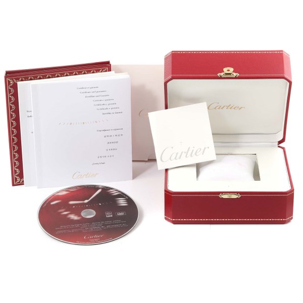 | Dial: | Silver grained dial with black radial Roman numerals. Sword shaped blued steel hands. Date calendar window at 3 o'clock. Secret Cartier signature at VII. |
