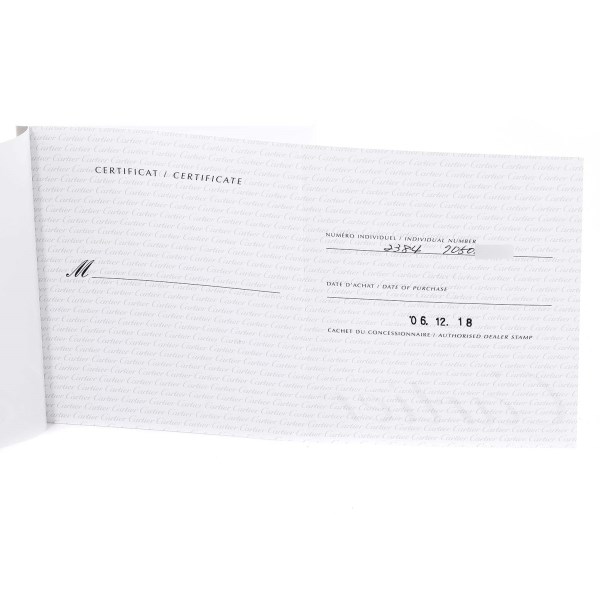 | Dial: | Silver opaline dial with black radial Roman numerals. Sword shaped blued steel hands. Secret Cartier signature at 10. |