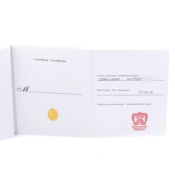 | Dial: | Silver guilloche dial with original Cartier factory diamond hour markers. Roman numeral at 12. Sword shaped blued steel hands. |