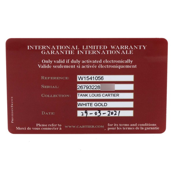 | Model Name: | Cartier Tank Louis White Gold Black Strap Ladies Watch W1541056 Box Card |