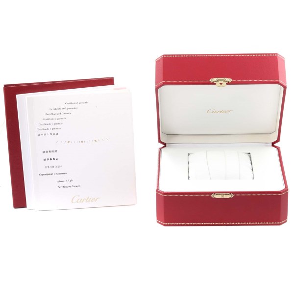 | Dial: | Silver opaline dial. Painted black Roman numerals. Sword shaped blued steel hands. Secret Cartier signature at VII. |
