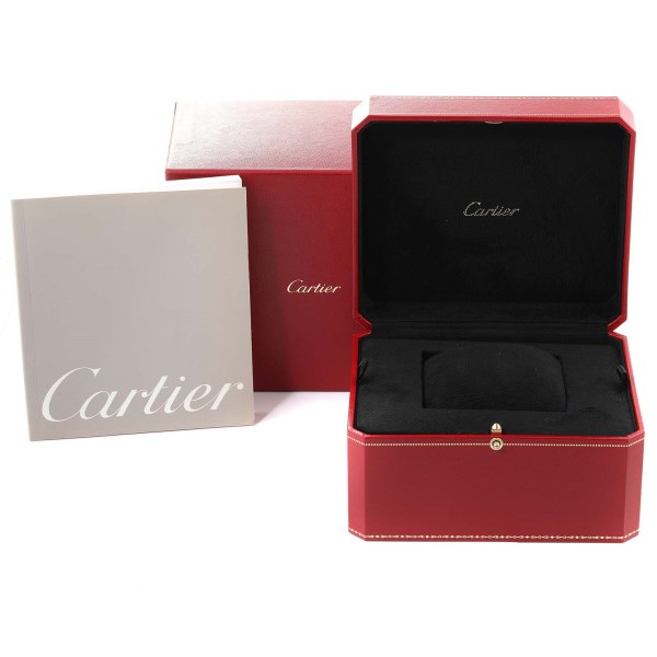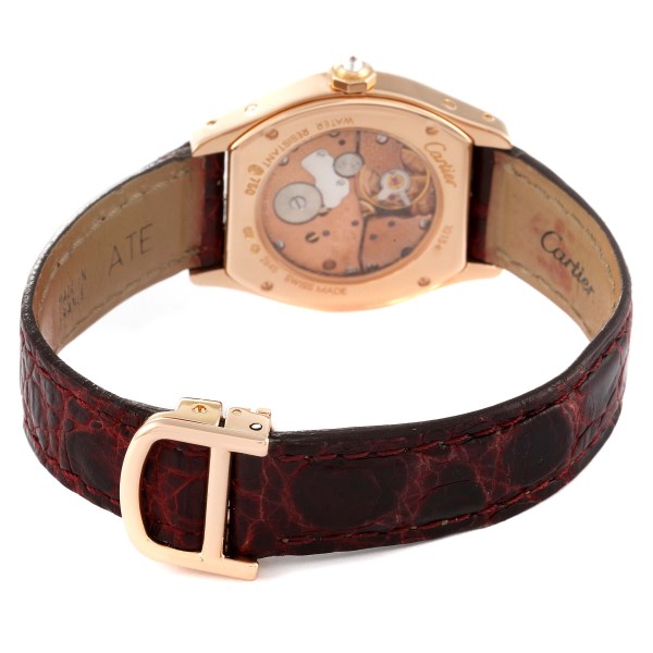 | Case: | 18K rose gold case 28 mm x 34 mm. Octagonal crown set with an original Cartier factory diamond. Original Cartier factory diamond bezel and lugs. Exhibition sapphire caseback. |