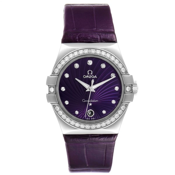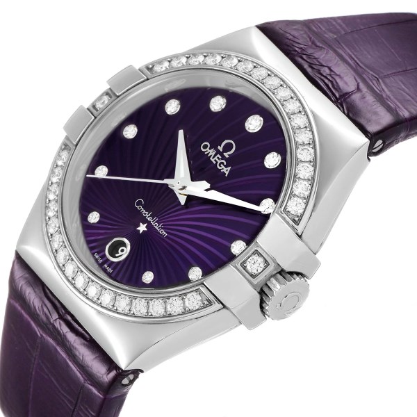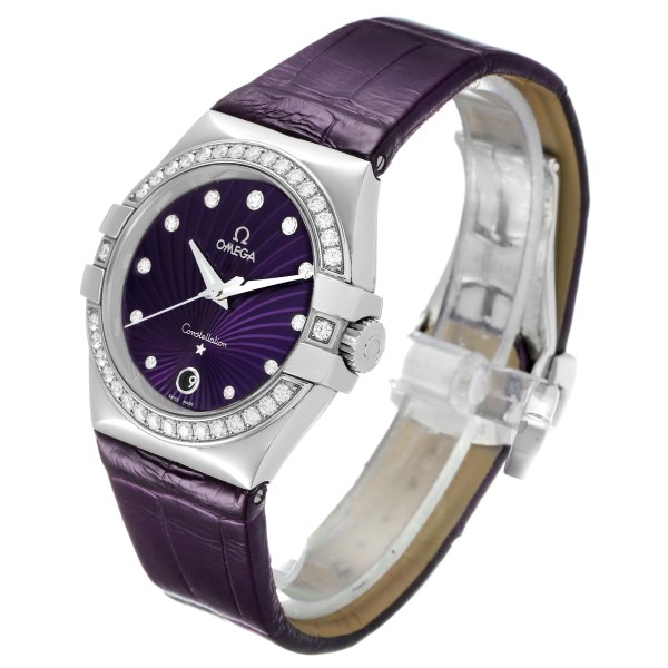 | Dial: | Purple dial with a supernova textured pattern and Omega factory diamond hour markers. Date window at 6 o'clock position. |