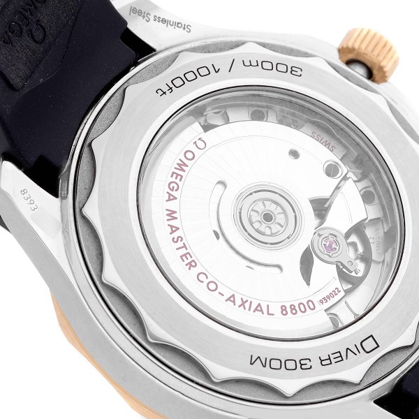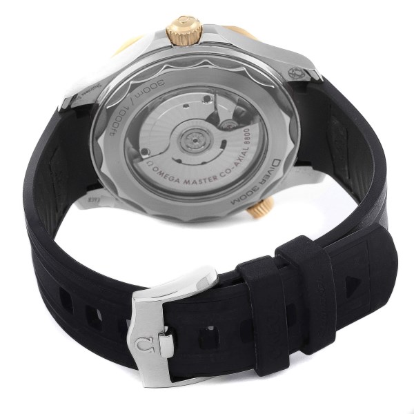 | Case: | Stainless steel and 18K yellow gold case 42mm in diameter. Conical design helium escape valve at 10 o'clock. Omega logo on the crown. Exhibition sapphire case back. |