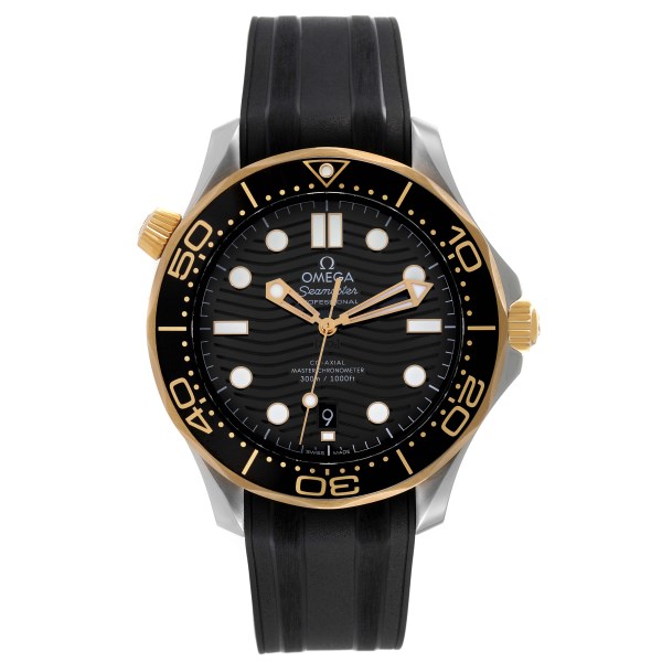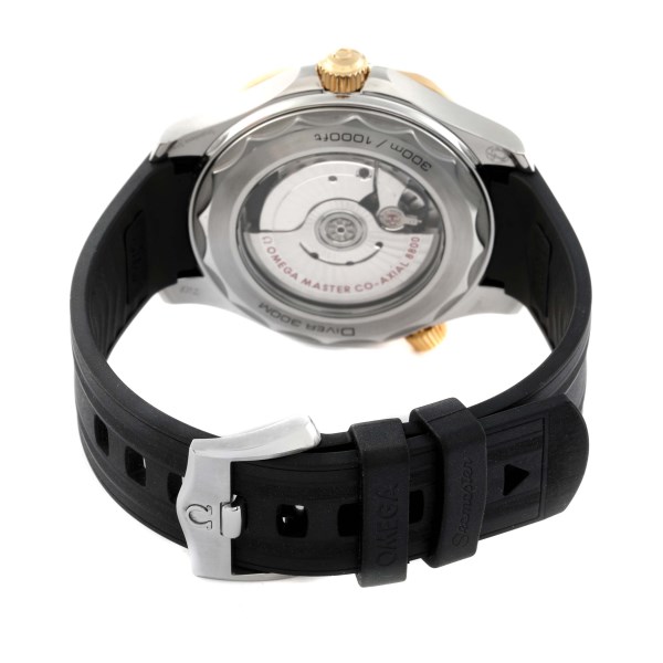 | Case: | Stainless steel and 18K yellow gold case 42mm in diameter. Conical design helium escape valve at 10 o'clock. Omega logo on the crown. Exhibition sapphire case back. |