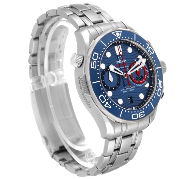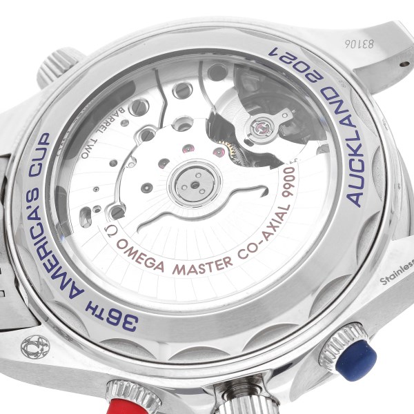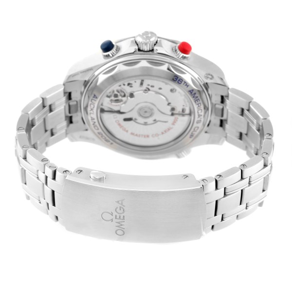 | Case: | Stainless steel case 44.0 mm in diameter. Omega logo on a crown. helium escape valve at 10 o'clock. Chronograph lock system located at 9 o'clock. |