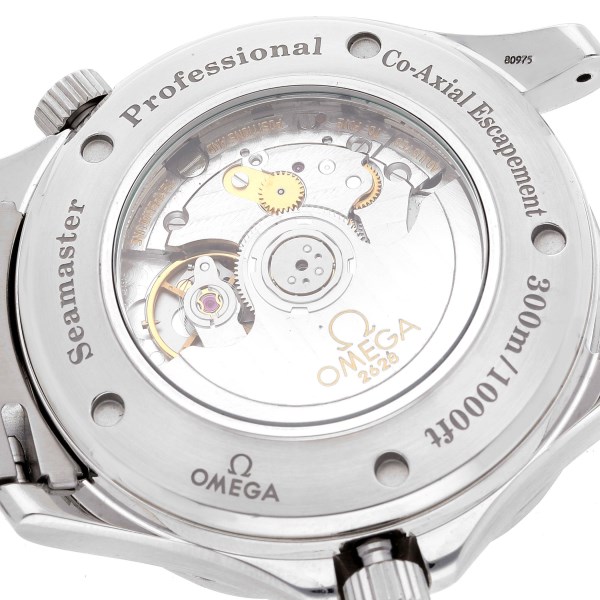 | Case: | Stainless steel case 41.0 mm in diameter. Omega logo on the crown. Helium escape valve at 10 o'clock. Exhibition sapphire case back. |