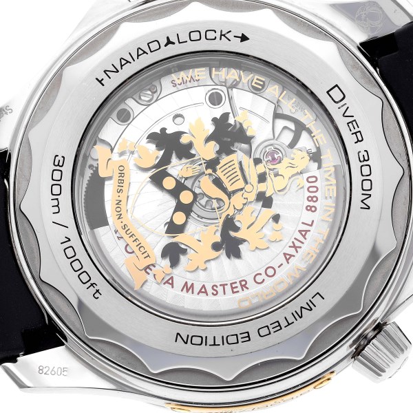 | Case: | Stainless steel case 42.0 mm in diameter. Omega logo on a crown. conical design helium escape valve at 10 o'clock. The Bond family coat-of-arms metallised in gold and black is on the inner side of the sapphire crystal caseback. 18k yellow gold plate with an engraved limited edition number on the left case edge. |