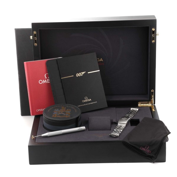 | Case: | Stainless steel case 42.0 mm in diameter. Omega logo on a crown. conical design helium escape valve at 10 o'clock. The Bond family coat-of-arms metallised in gold and black is on the inner side of the sapphire crystal caseback. 18k yellow gold plate with an engraved limited edition number on the left case edge. |