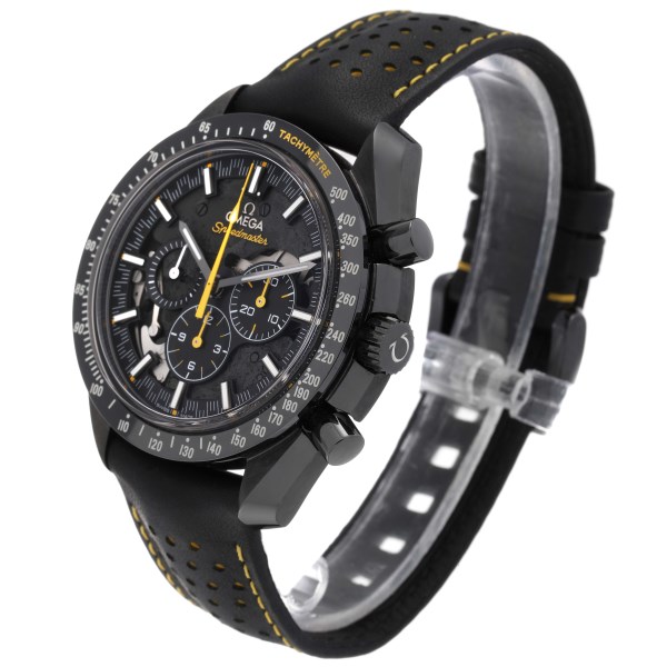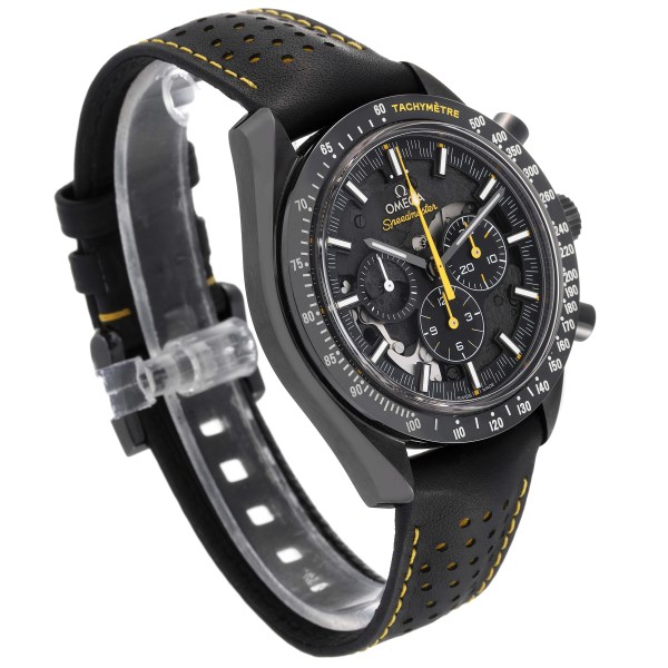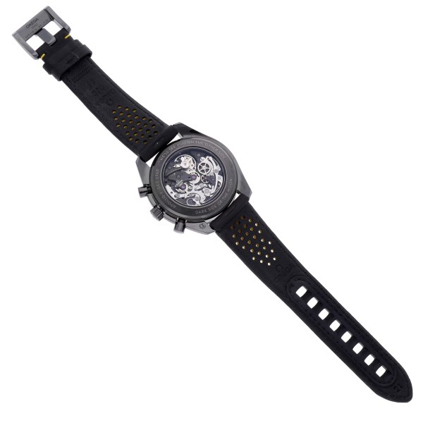 | Dial: | Black skeleton carbon dial with striking Moonwatch-style hands and 3 ceramic subdials to measure minutes, hours, and running seconds. Luminescent hands and hour markers. Yellow chronograph hands. |