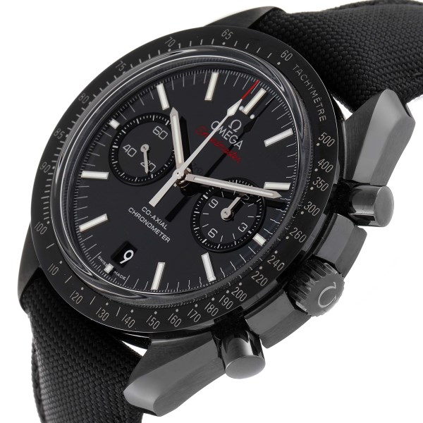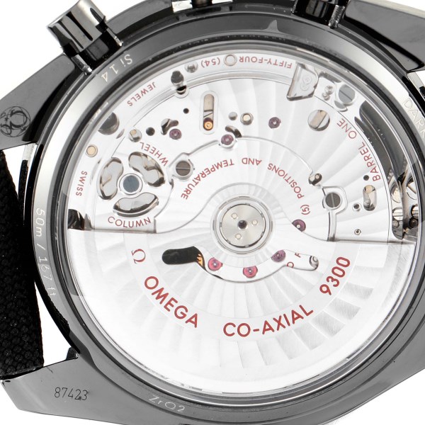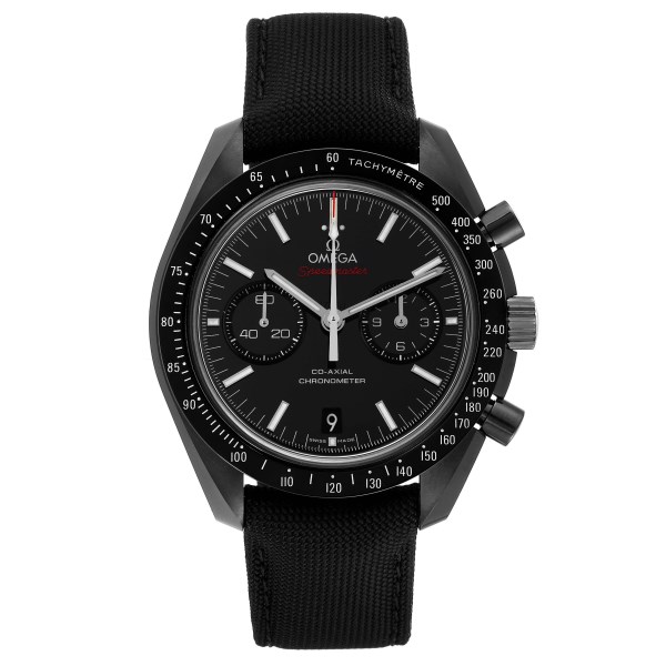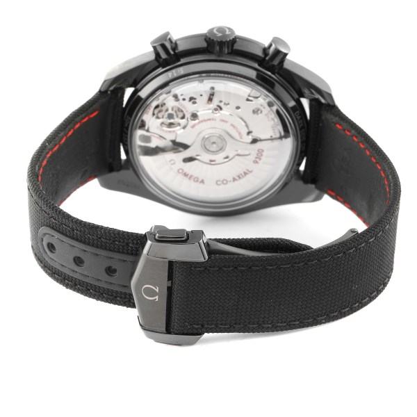 | Dial: | Black zirconium oxide ceramic dial with striking 18K white gold Moonwatch-style hands and two ceramic subdials at 3 and 9 o'clock for 30 seconds and 12 hour. Luminiscent hands and hour markers. Date display at 6 o'clock aperture. |