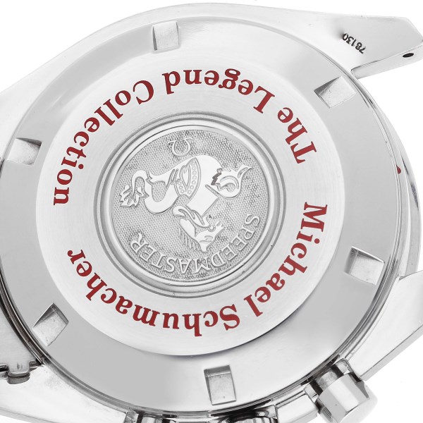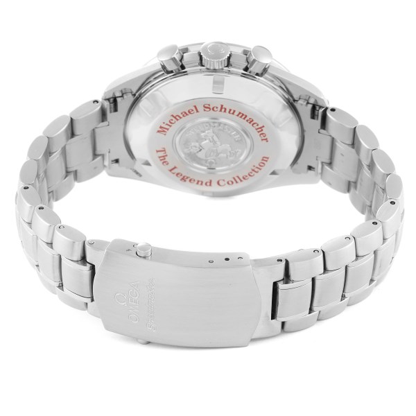 | Case: | Stainless steel round case 42.0 mm in diameter. Omega logo on the crown. "Michael Schumacher - The Legend Collection" written in red on the case back. |