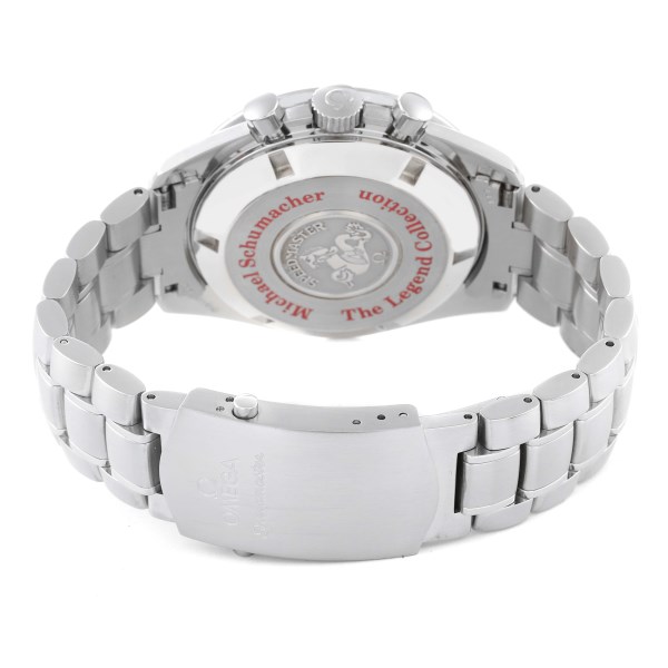 | Case: | Stainless steel round case 42.0 mm in diameter. Omega logo on the crown. "Michael Schumacher - The Legend Collection" written in red on the case back. |