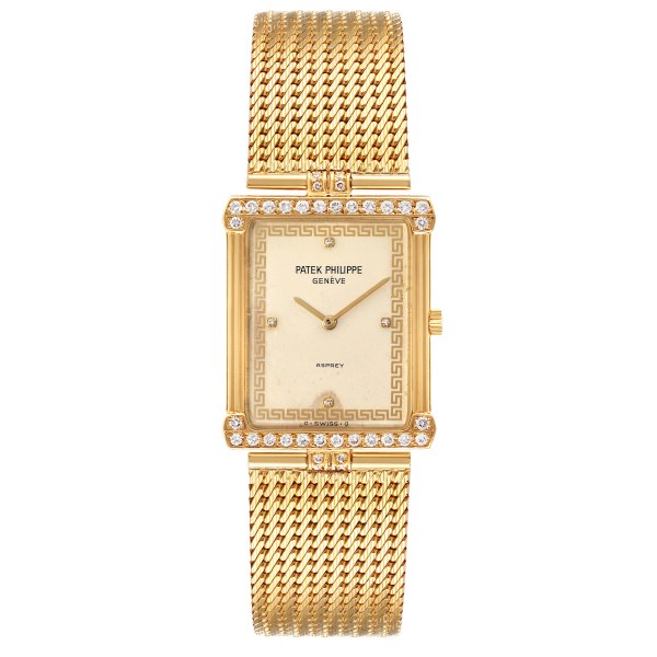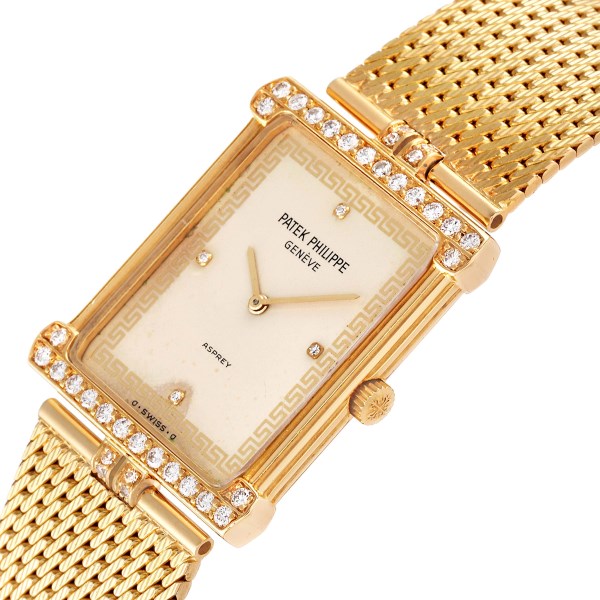 | Model Name: | Patek Philippe Asprey 18k Yellow Gold Ivory Dial Diamond Mens Watch 3776 |