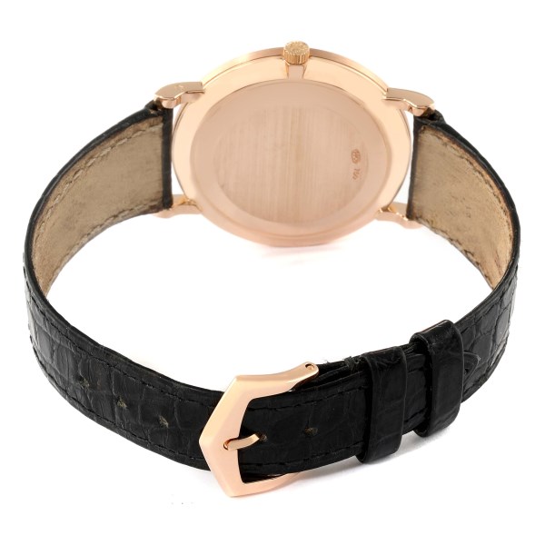 | Bracelet: | Black leather strap with 18K rose gold tang buckle. |