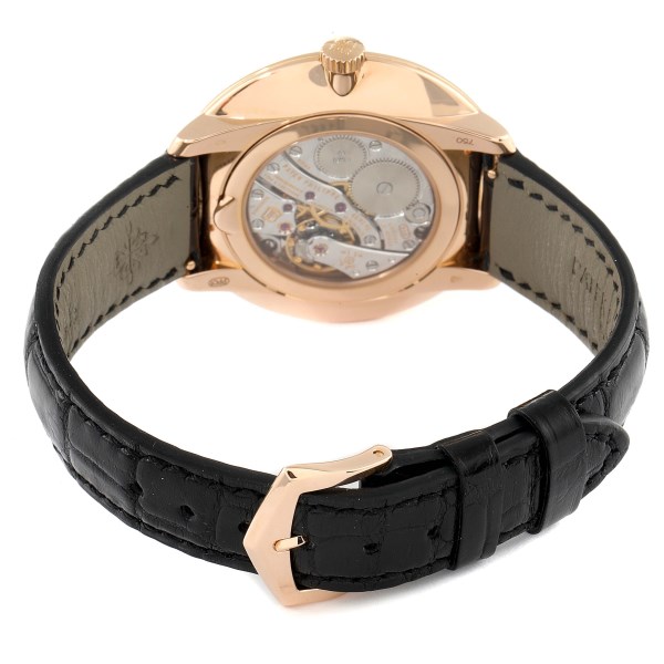 | Case: | 18k rose gold case 38 mm in diameter. Down-turned lugs. Exhibition case back. |