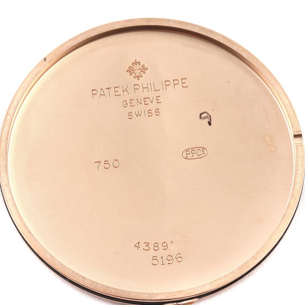 | Case: | 18k rose gold case 37.0 mm in diameter. Snap-on case back, concave lugs. |