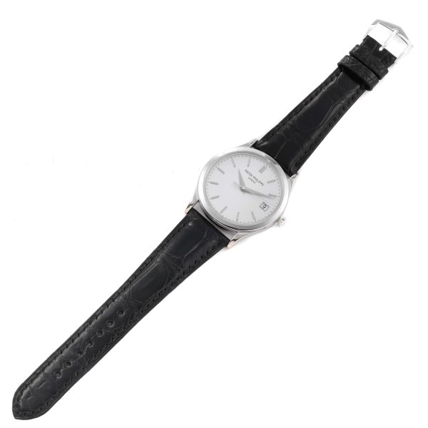 | Dial: | Opaline silver dial with raised white gold index hour markers. White gold dauphine hands. Framed date window at 3 o'clock. |