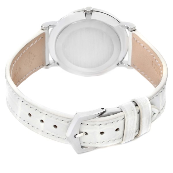 | Bracelet: | White leather strap with 18K white gold tang buckle. |