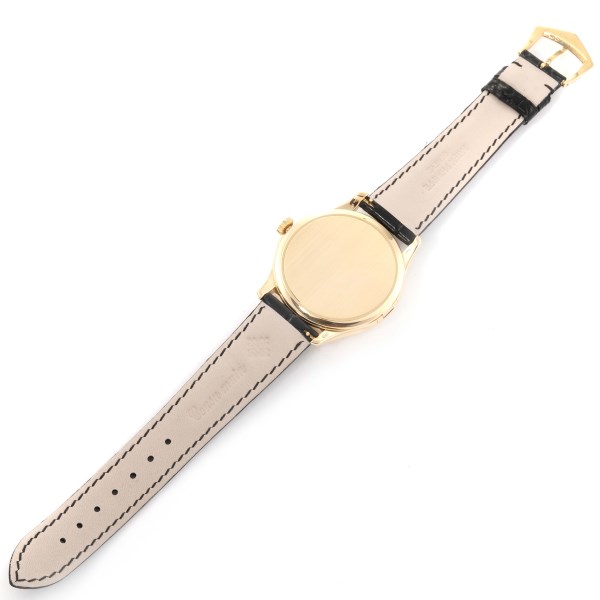 | Bracelet: | Black leather strap with yellow gold tang buckle. |