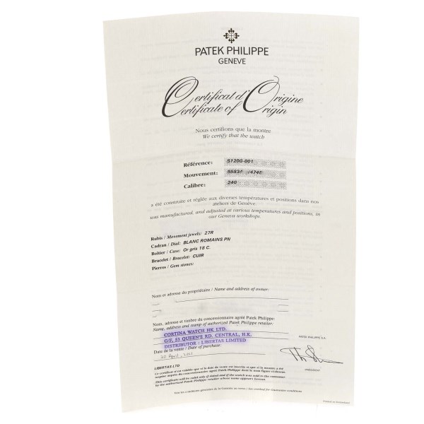 | Model Name: | Patek Philippe Calatrava White Gold Automatic Mens Watch 5120G Papers |