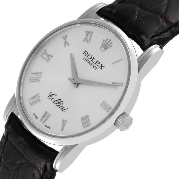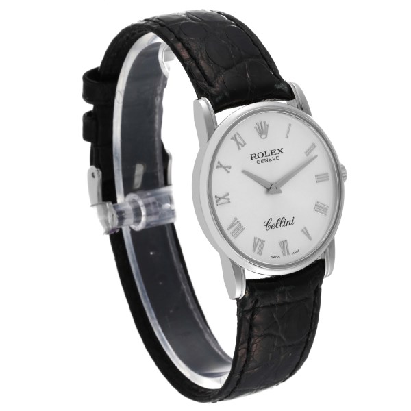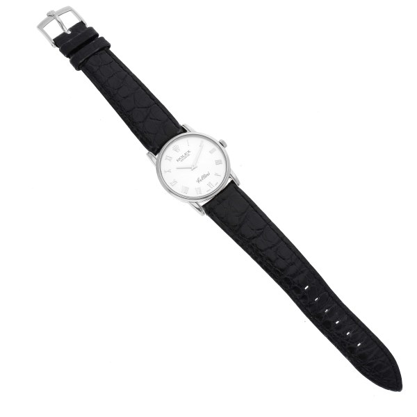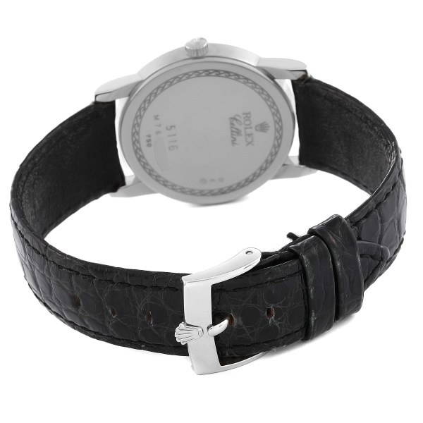 | Case: | 18k white gold slim case 31.8 mm in diameter. Rolex logo on the crown. |