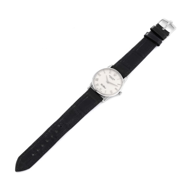| Bracelet: | Black leather strap with Rolex 18k white gold tang buckle. |