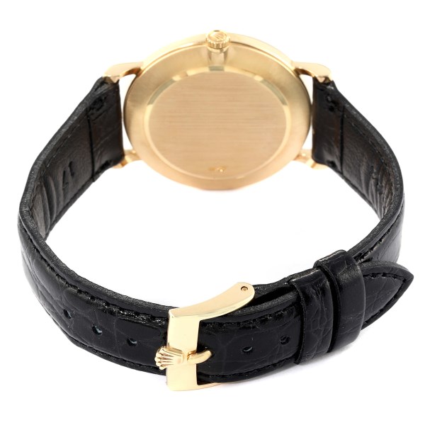 | Bracelet: | Custom black leather strap with Rolex 18K yellow gold tang buckle. |