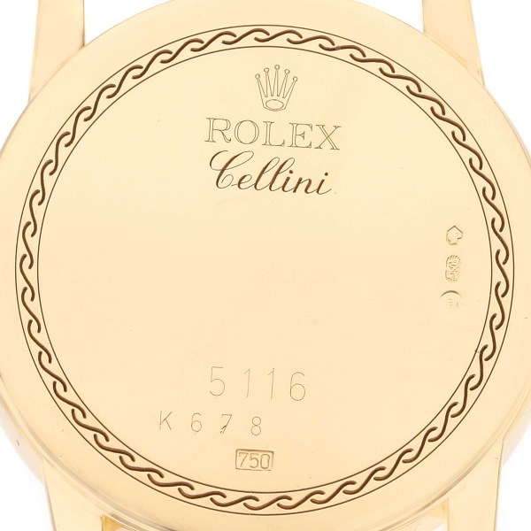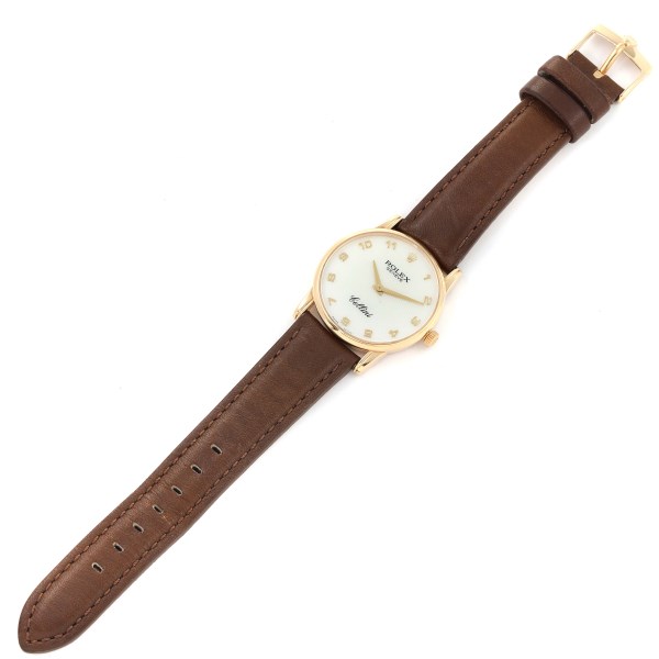 | Case: | 18k yellow gold slim case 31.8 x 5.5 mm in diameter. Rolex logo on a crown. |